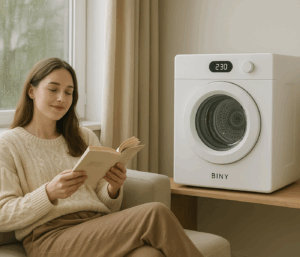 「ずっと乾燥機が欲しかったけど、音の問題で諦めていました。Binyは本当に静かで、夜に動かしても全く気になりません。